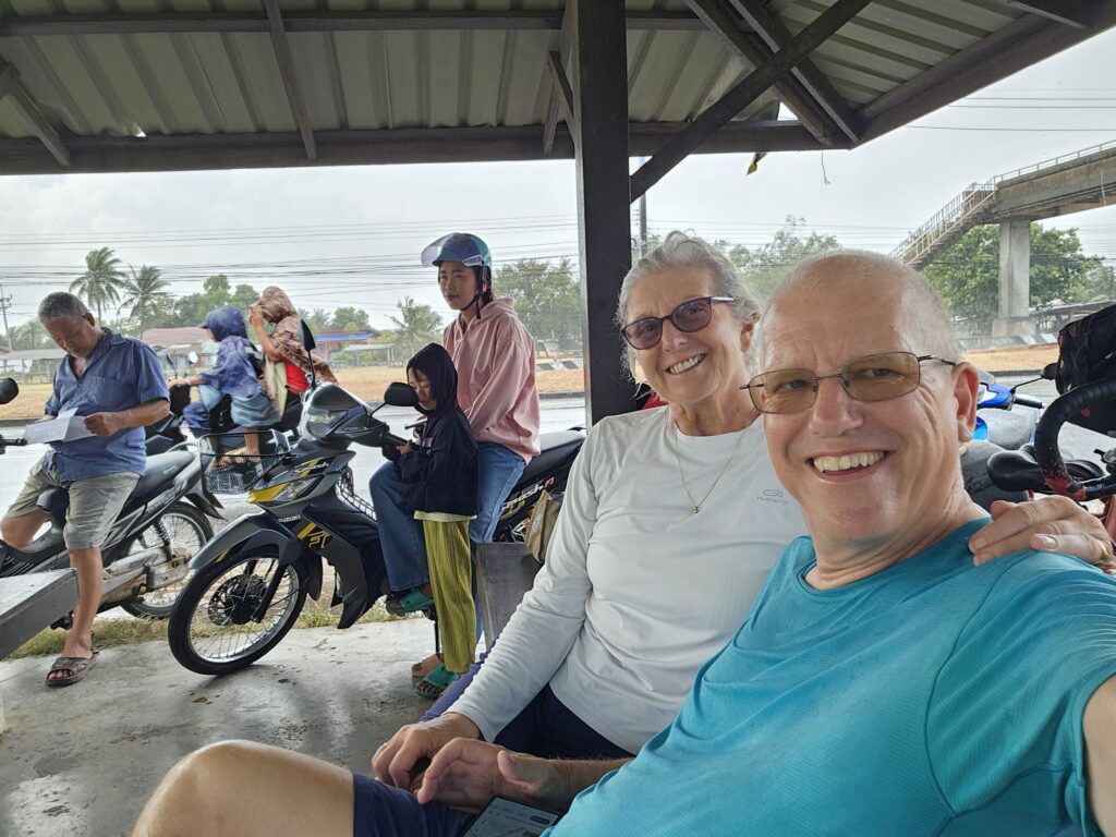 We left Songkhla the next morning in a very brief window of dark cloud and no rain and got about 10km of a short 30km day and again it tipped it down. We sat in a bus shelter for a couple of hours watching the cars crawl past and very brave souls on mopeds splash though the puddles whilst carrying an umbrella and were mightily glad we’d invested in some 30p plastic kagools from 7-Eleven.  We’ve brought our top quality waterproofs with us, but they’re pointless as you sweat more in them than it keeps you dry and our cheapy Kagools seem to work better..  In the end it took us 6 hours to do a less than 2 hour cycle, with the rest of the time in various shelters and cafes.